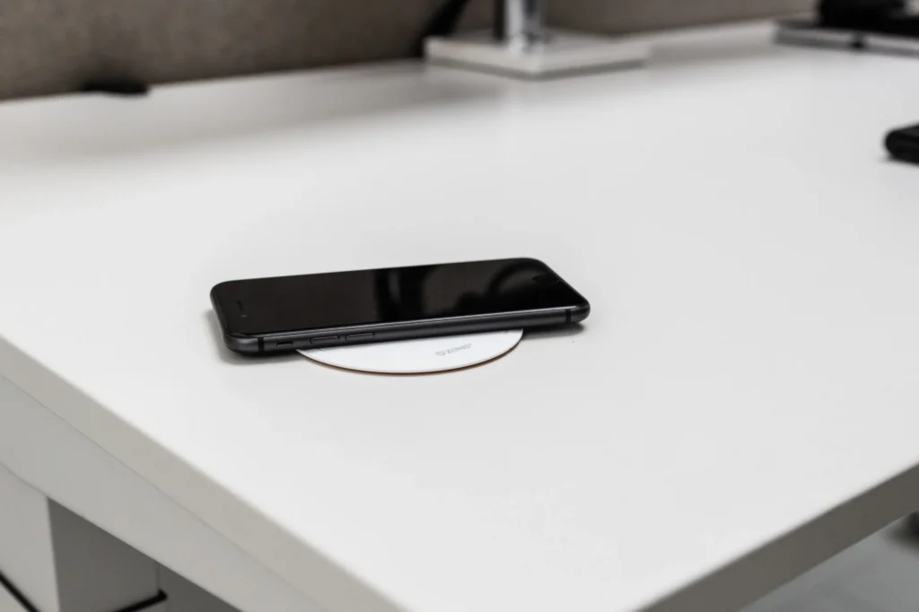 Voor een modern kantoor zonder rondslingerende laadkabels integreren wij draadloze oplaadtechnologieën (zoals van partner Zens) direct in het bureaublad. Handig, duurzaam en het ziet er ook strak en professioneel uit.